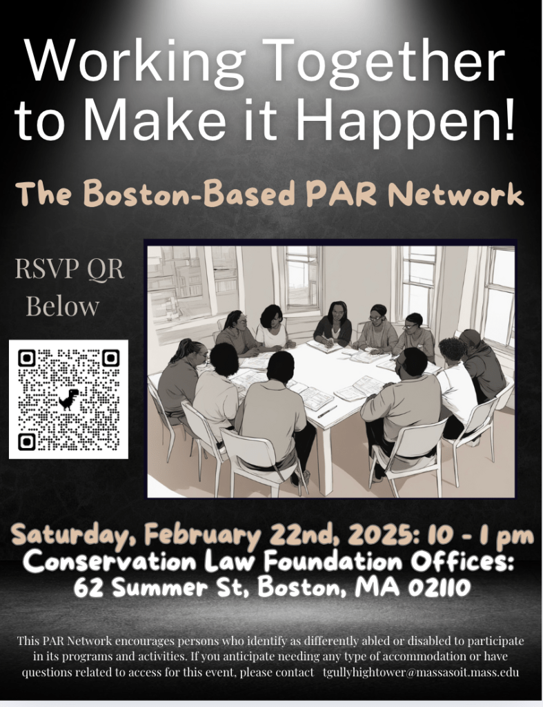 The next Boston-Based PAR Network has been planned for Saturday, Feb 22nd, 2025, and will take place at the Healthy Neighborhood Study, Conservation Law Foundation offices, at 62 Summer Street in Downtown Boston. The event will run from 10-1 pm. The theme for this meeting will be “Working Together to Make it Happen” where we will do a “Power Analysis” of housing and education resources and start to think about how our work could look when we focus our strengths into Action. There will be a light brunch served as well as time built in for individual project reflection and feedback. We welcome interested folks to join us in community and solidarity. Please complete the RSVP here https://forms.gle/SLKto4jhXpmg8tUEA